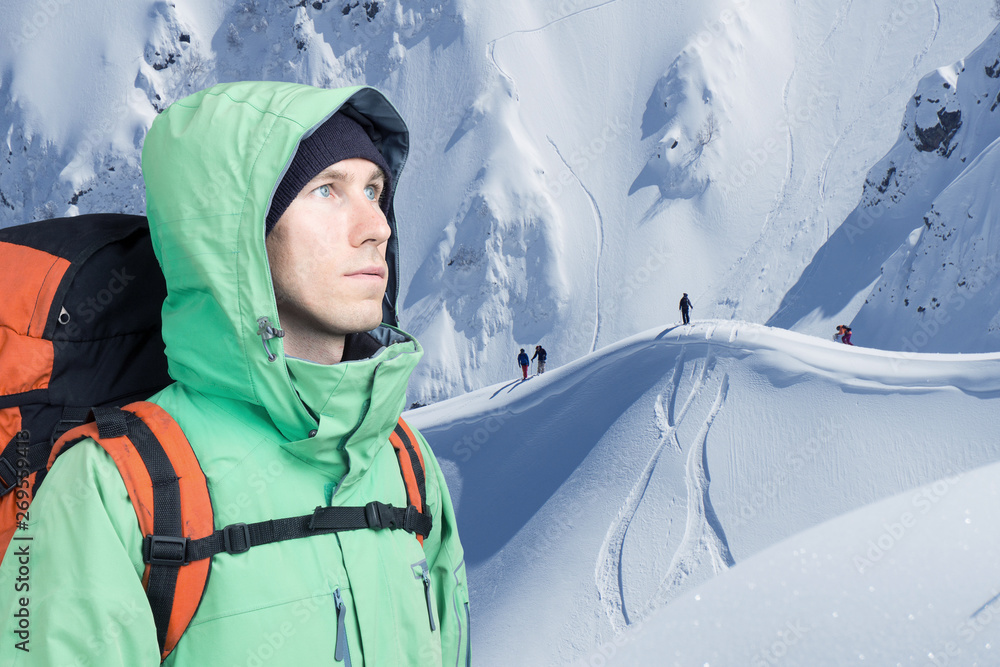 Adventurous young man with backpack standing on mountainside view and looking out. Mountaineering, extreme sport. Active lifestyle and tourism.