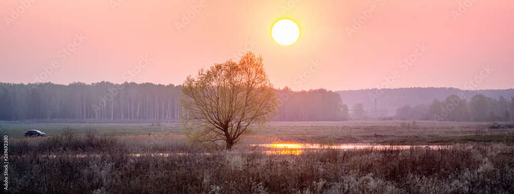 panorama of evening landscape with a tree near the river, Russia, Ural