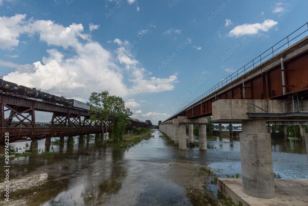 Two bridges over the Mississippi river in Memphis in springtime, greatly elevated water level