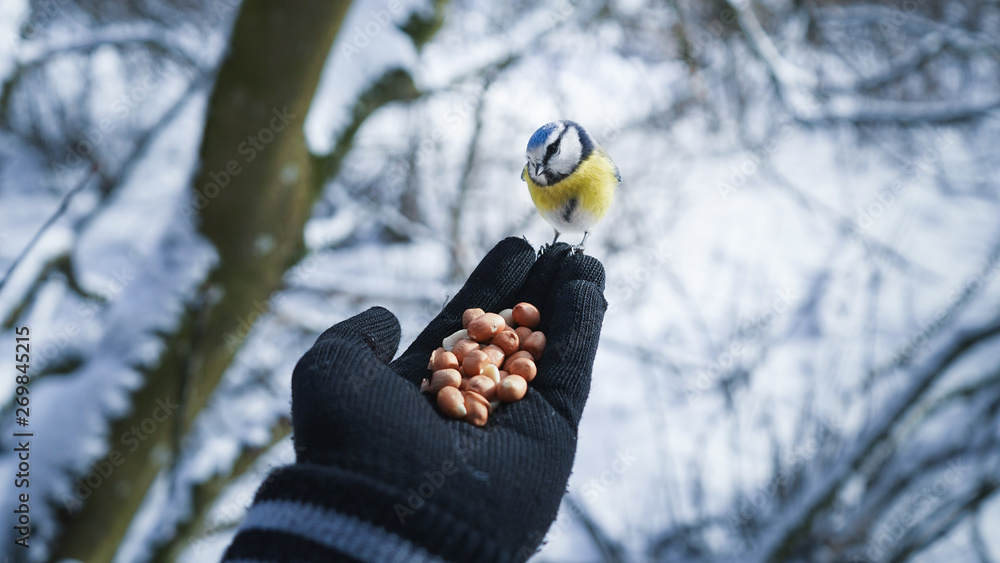 Person feeding a blue tit on cold winter day in Turku, Finland