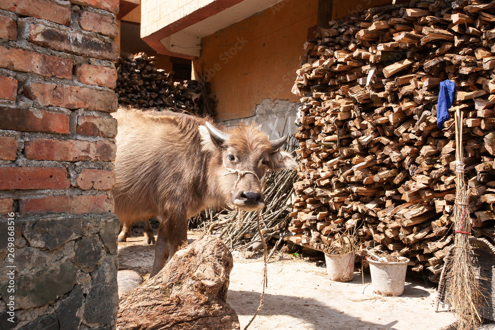 A calf in the courtyard in an old village.