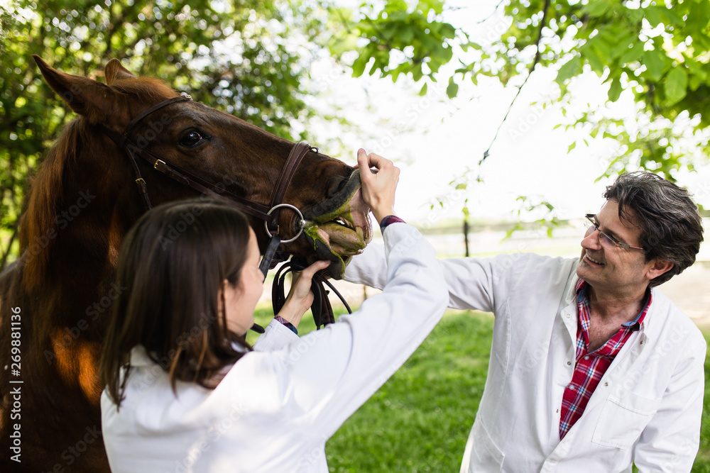 Male and female veterinarians examining horse.