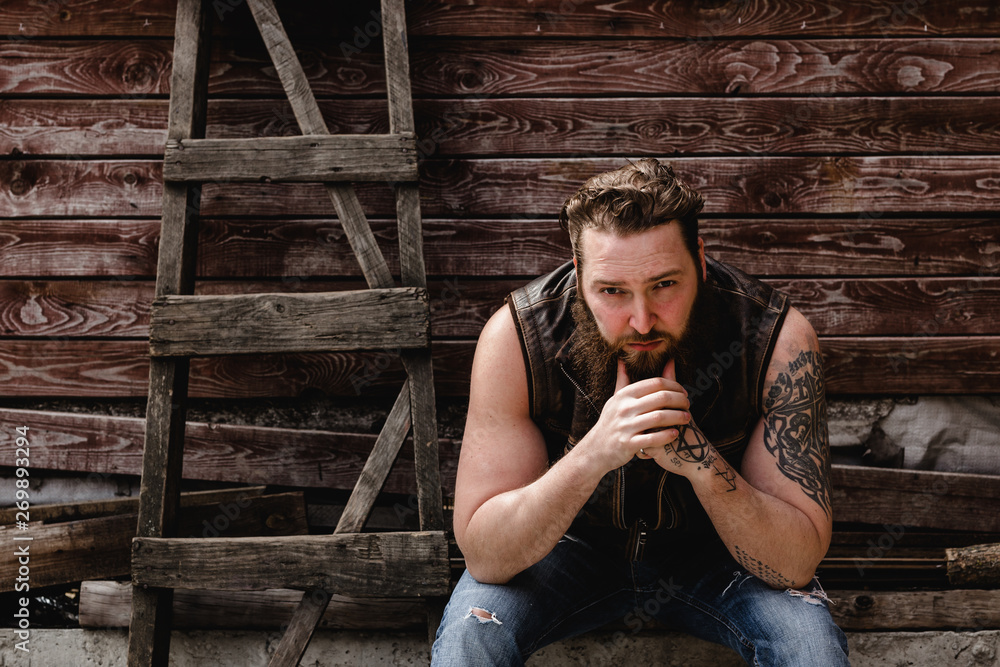 Strong brutal man with a beard and tattoos on his hands dressed in leather vest and jeans sits on a wooden wall background next to a wooden ladder outside