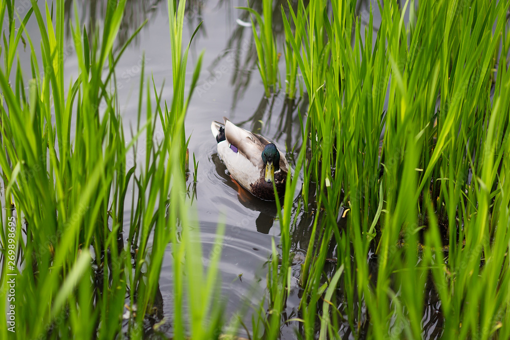 wild duck Drake hiding in the grass in the Park near the shore, green high sedge