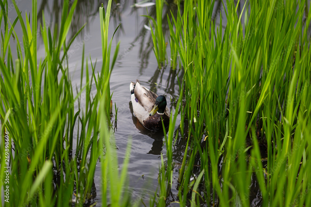 wild duck Drake hiding in the grass in the Park near the shore, green high sedge