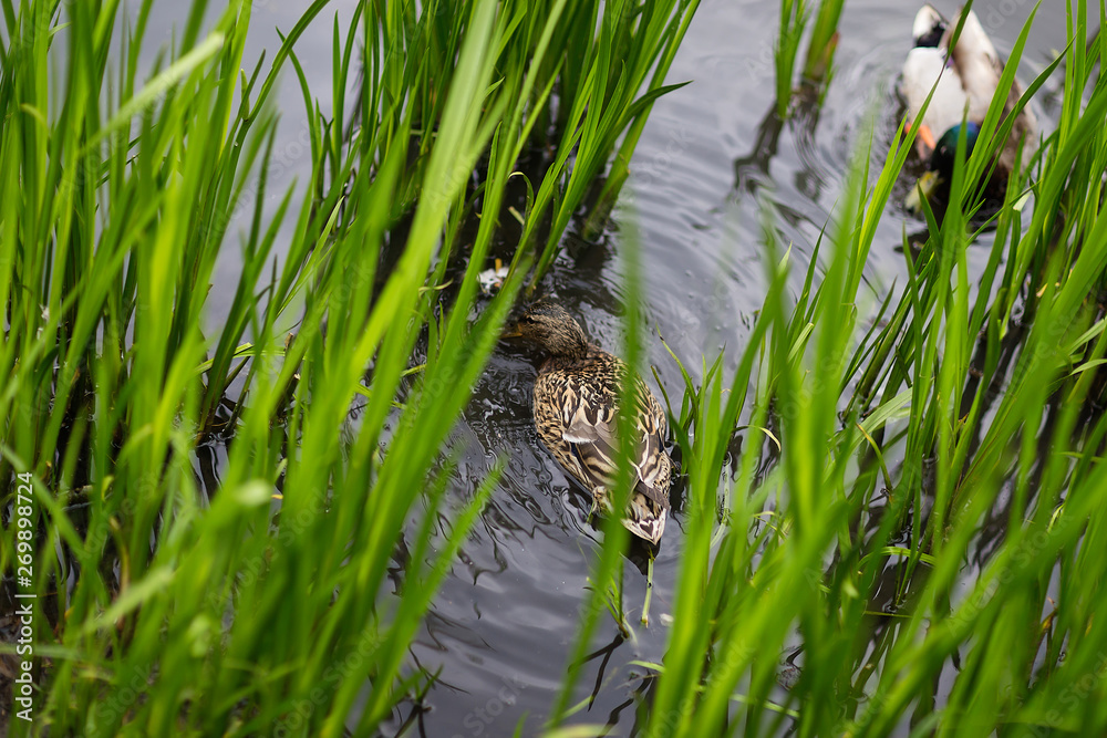 wild duck Drake hiding in the grass in the Park near the shore, green high sedge