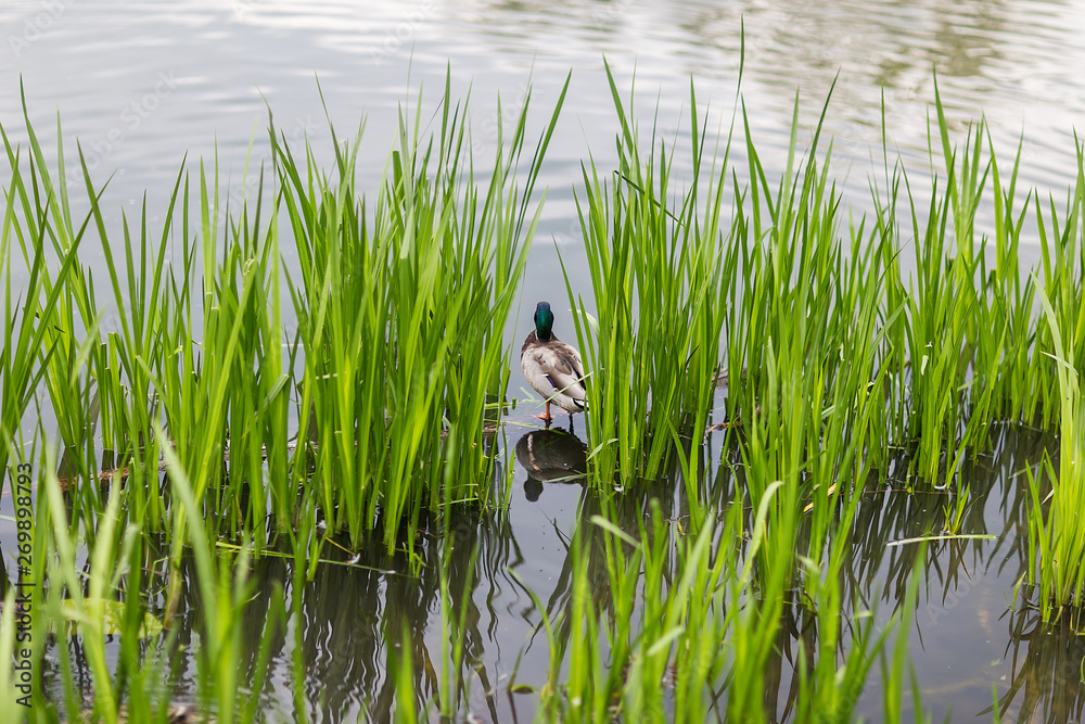 wild duck Drake hiding in the grass in the Park near the shore, green high sedge