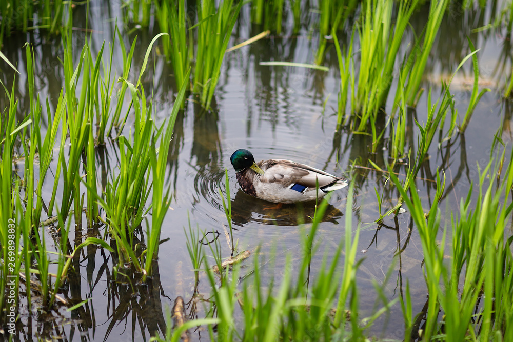 wild duck Drake hiding in the grass in the Park near the shore, green high sedge