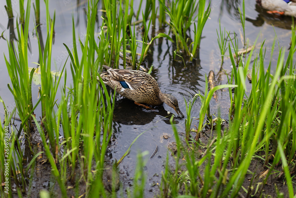 wild duck Drake hiding in the grass in the Park near the shore, green high sedge
