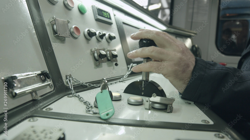 Interior view of the drivers cab high speed train. Train driver hand on thrust lever of dashboard controls in cockpit cabin.