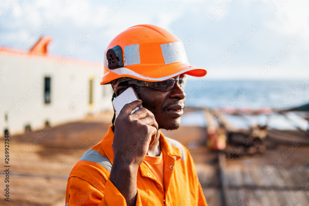 Marine seaman or bosun on deck of vessel or ship . He is speaking on the mobile cell phone