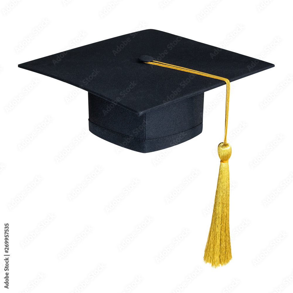 Graduation hat, Academic cap or Mortarboard in black isolated on white background (clipping path) for educational hat design mockup and school commencement hat mock-up template