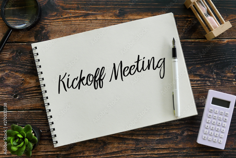 Top view of magnifying glass,plant,pen,calculator,sand clock and notebook written with Kickoff Meeting.