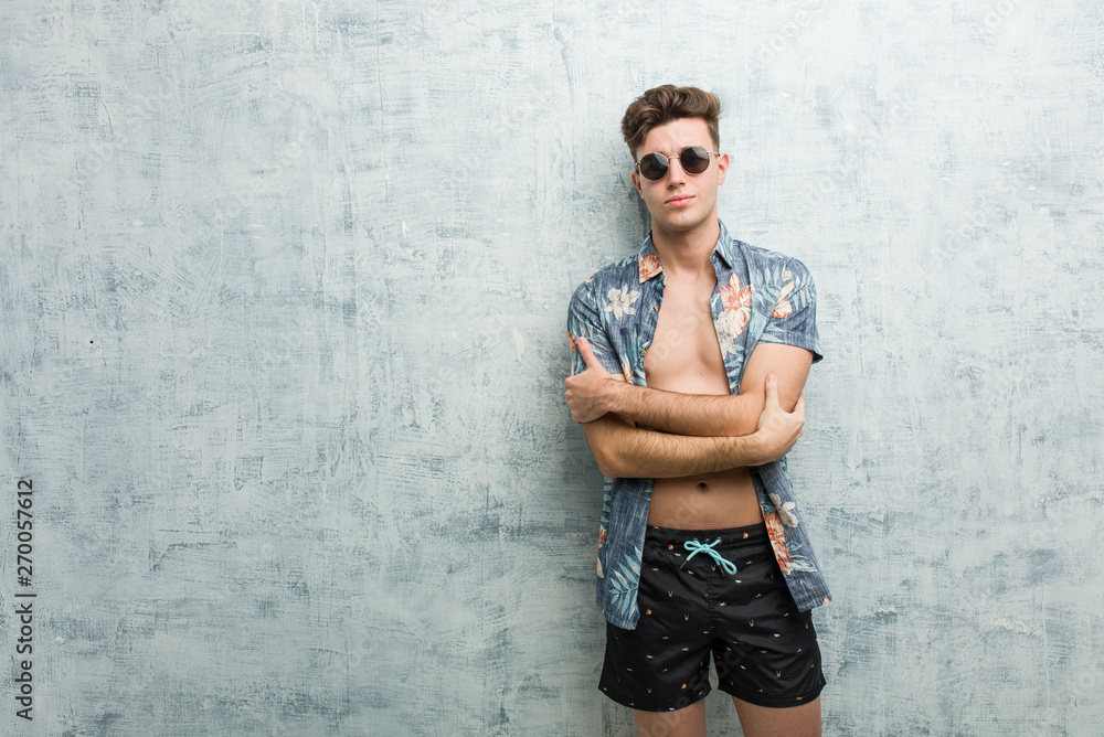 Young caucasian man wearing a swimsuit who feels confident, crossing arms with determination.