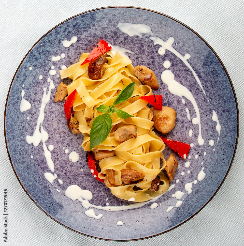 Tagliatelle with fried mushrooms. Italian traditional dish. On a white background