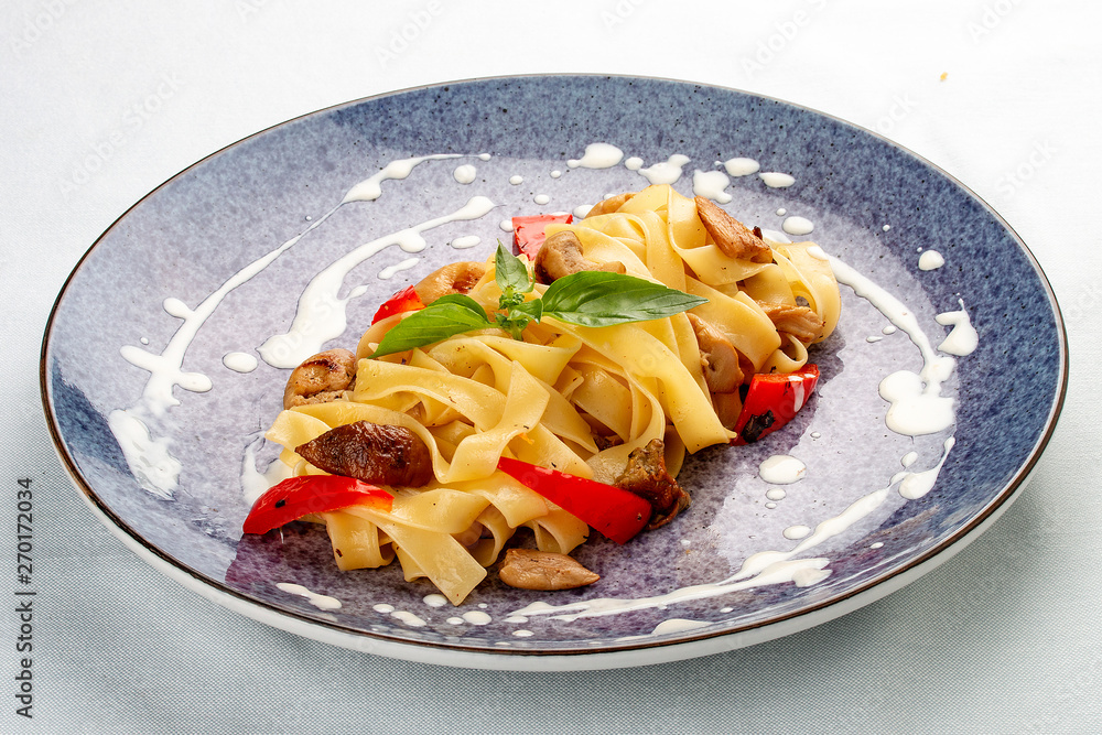 Tagliatelle with fried mushrooms. Italian traditional dish. On a white background