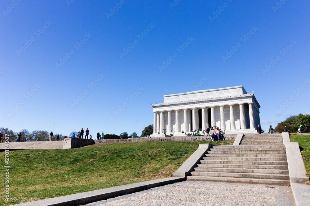 View of the historic Abraham Lincoln Memorial from the ceremonial boulevard of the National Mall, Washington DC