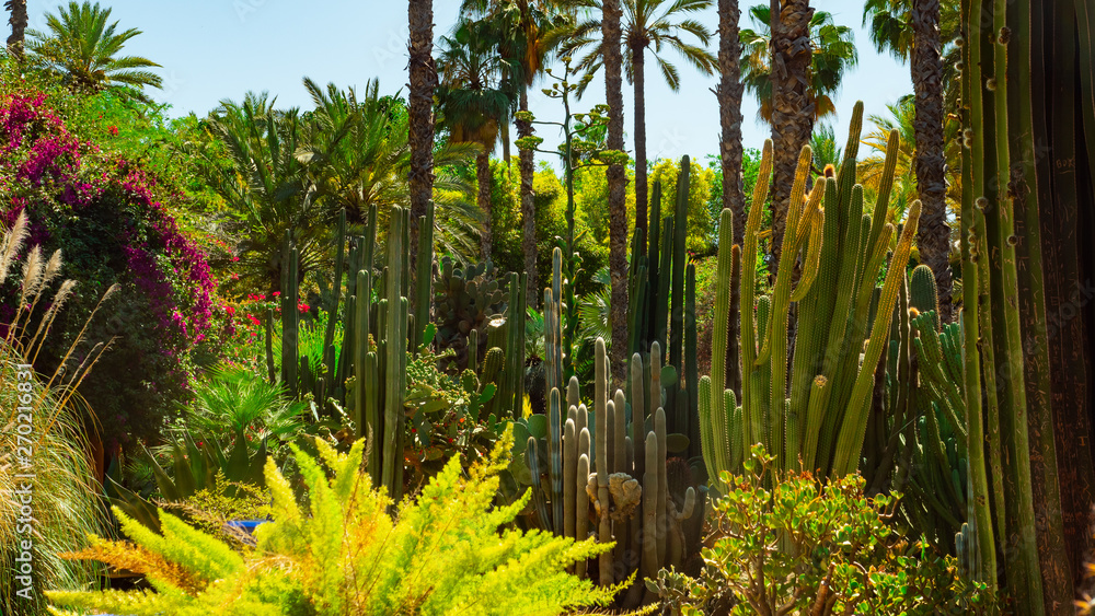 Jardine Majorelle In Marrakesh, Morocco, Africa, Yves Saint Laurent magic garden, flowers cactus trees background