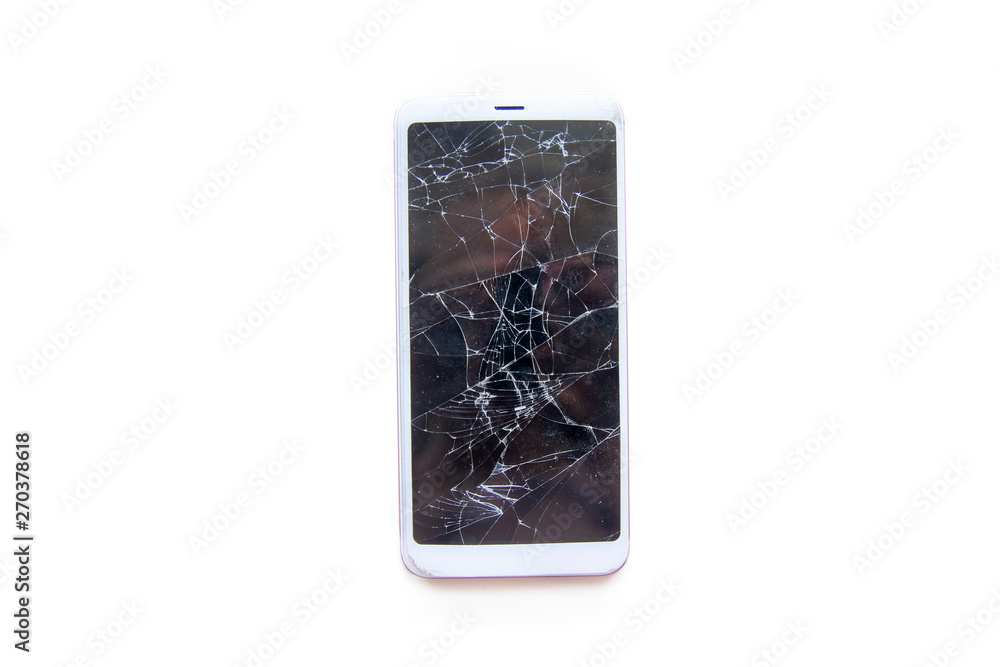 Mobile smartphone with broken glass screen isolated on white. copyspace fo text. Service, repair and technology concept.