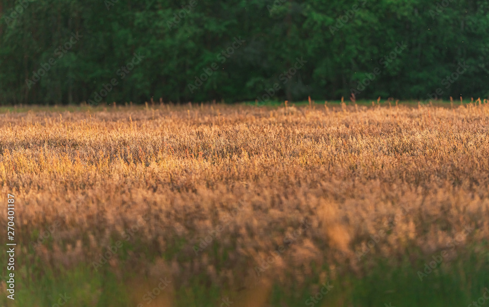 Countryside with yellow grass and forest edge in evening sunlight in spring.