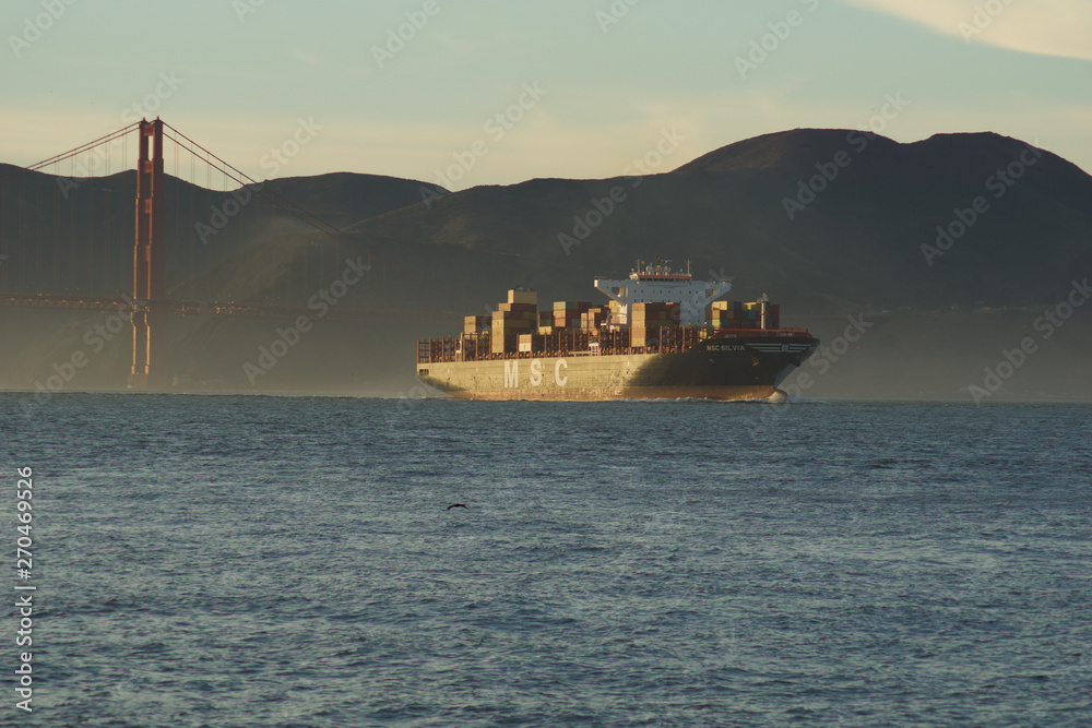 SAN FRANCISCO, CALIFORNIA, UNITED STATES - NOV 25th, 2018: MSC Cargo Ship SILVIA entering the San Francisco Bay under the Golden Gate Bridge on its way to the Port of Oakland - a fully loaded