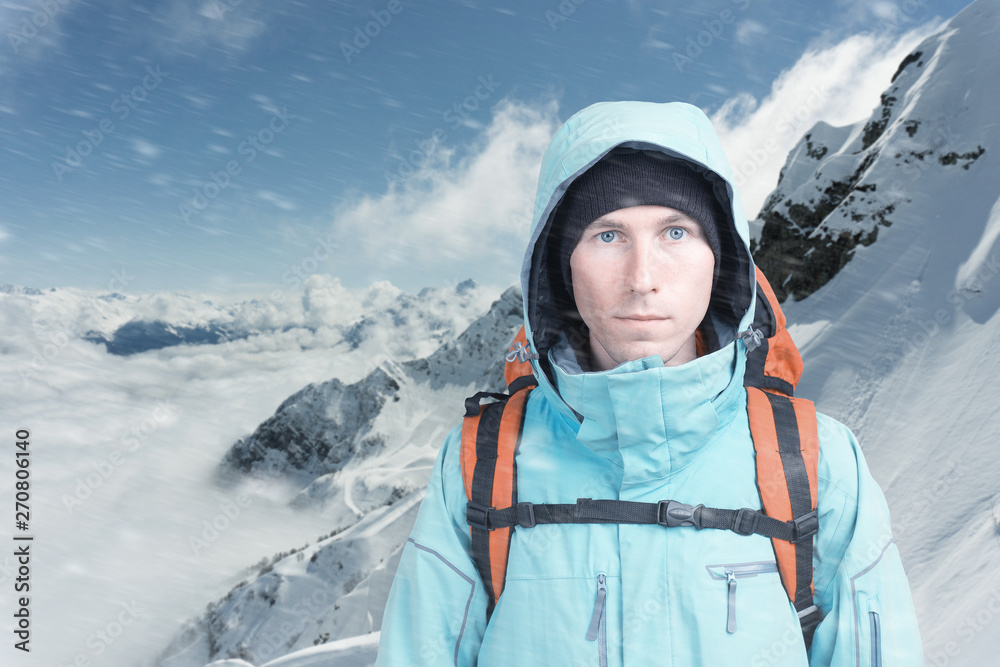 Young male mountain climber on winter mountain top view looking at camera. Front view. Active lifestyle in cold weather. Winter mountain landscape and cloudy sky. Active lifestyle and tourism.
