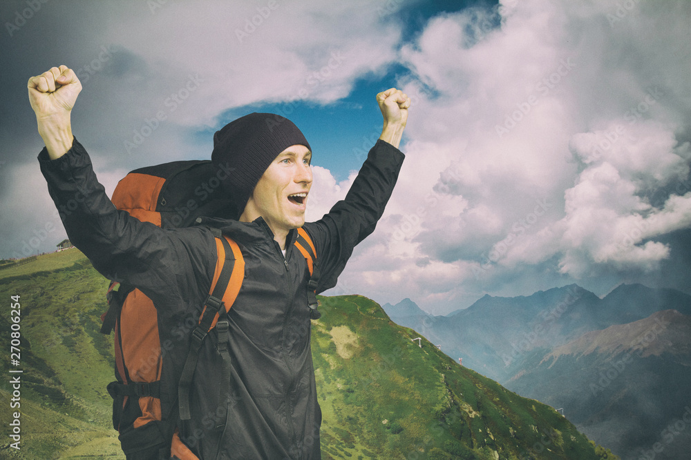 Young hiker shouting out on top with his hands raised, side view. Active lifestyle and tourism concept.