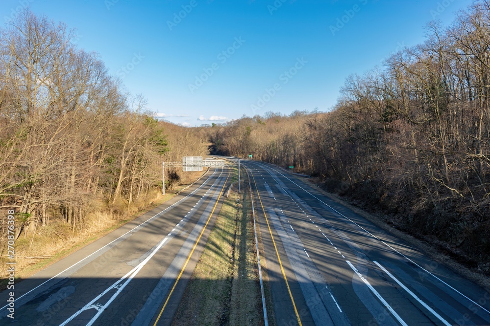 Bend in the road on an empty highway, with no cars or motorists in sight