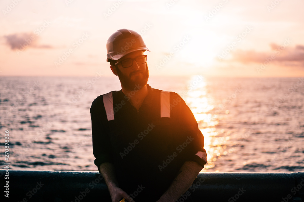 Deck Officer on deck of offshore vessel or ship , wearing PPE personal protective equipment