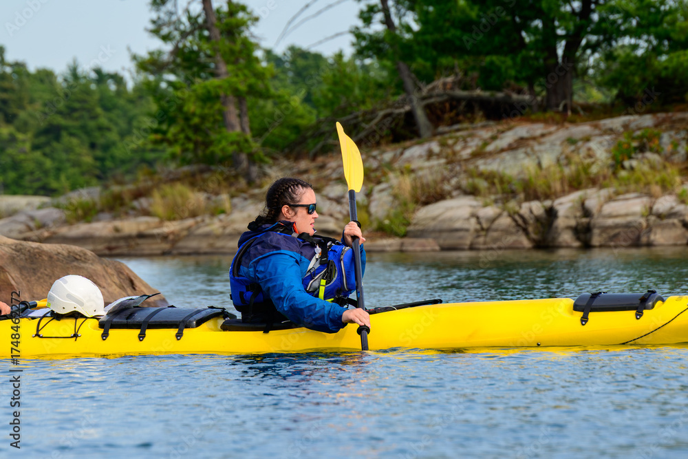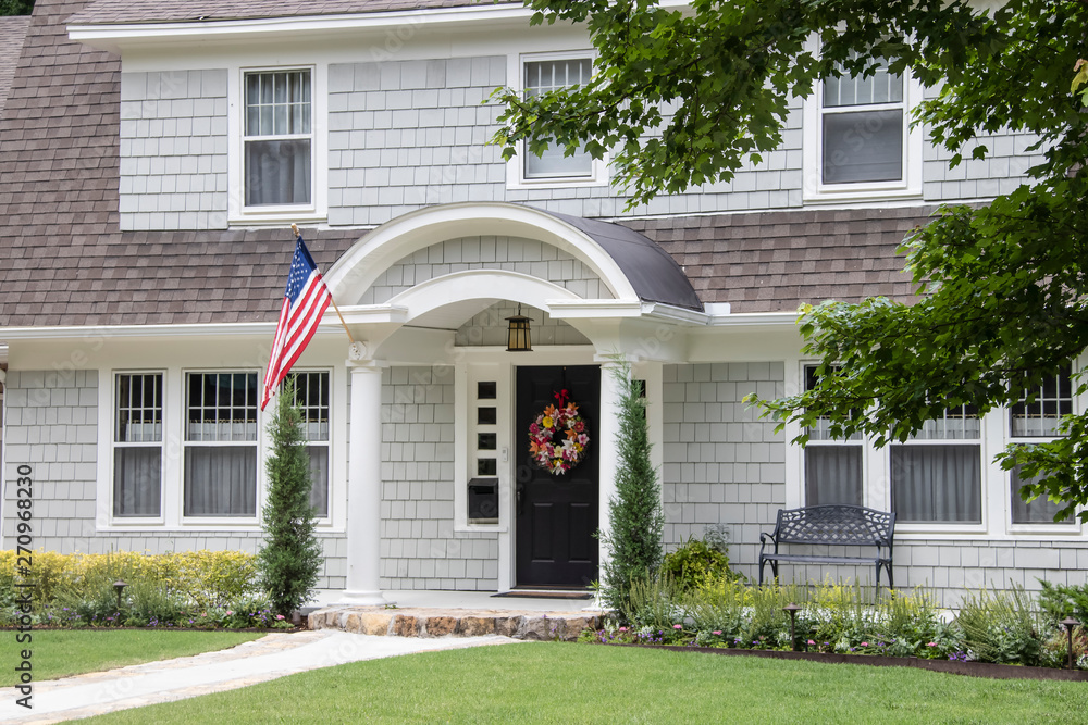 Neat and pretty shingled retro house with arched entryway and beautiful landscaping with colorful summer wreath on front door and American Flag attached to front column