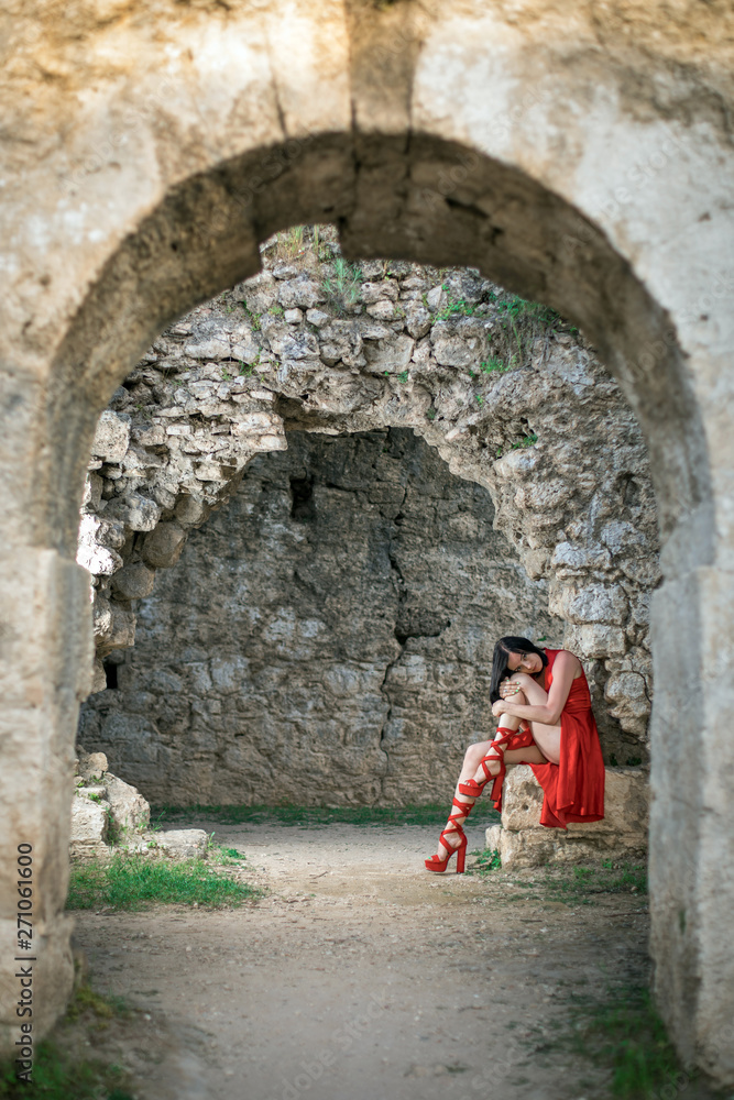 Woman in red dress is sitting at the ruins of an ancient city, Side, Turkey