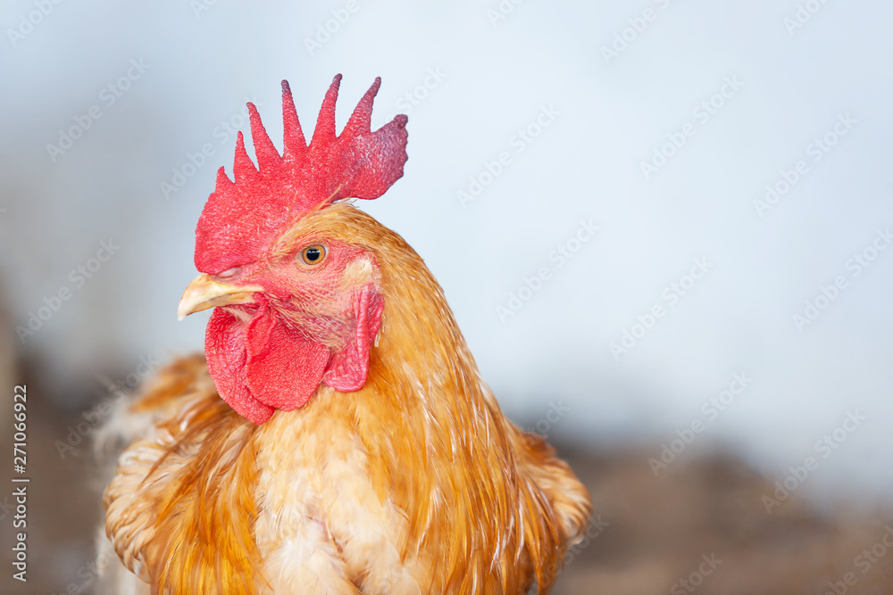 Adorable portrait of a brown Betong rooster in a henhouse in Betong District, Yala, Thailand.
