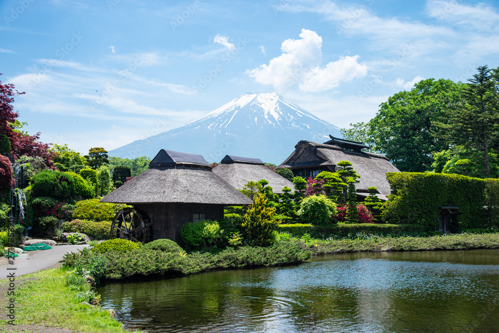 Beautiful Fuji mountain with cloud and blue sky in the summer at Oshino Hakkai the old Japanese village, the famous landmark and attraction place of tourists who have a long holiday in Japan