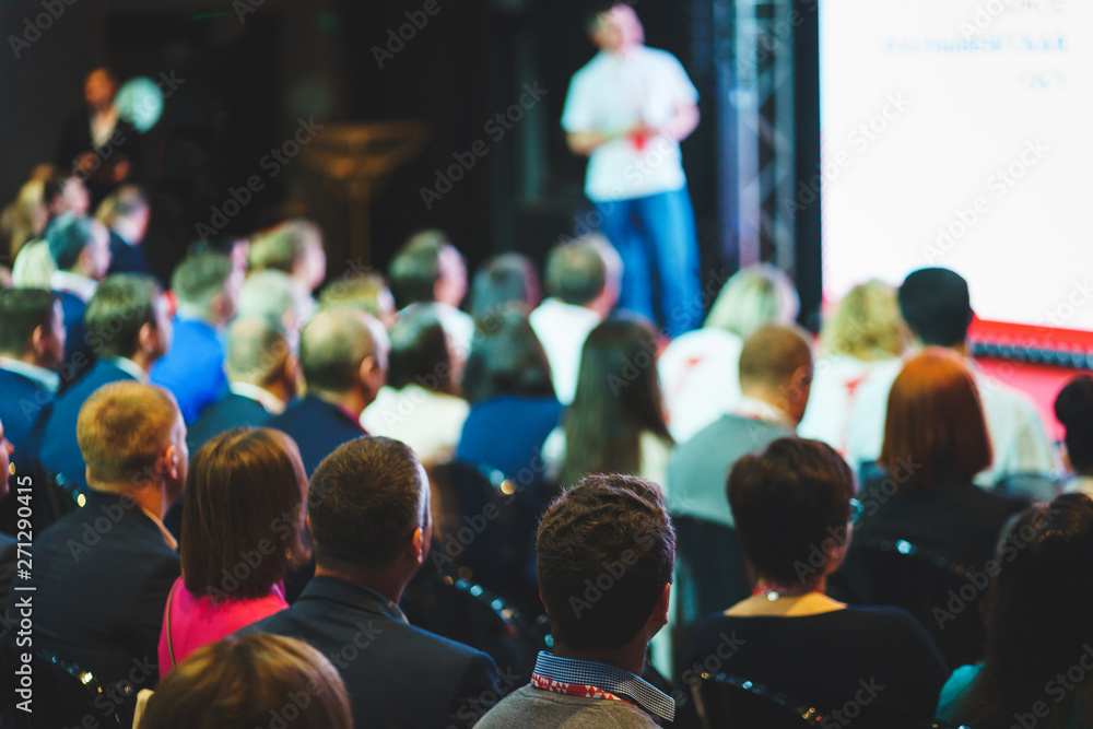 Conference participants, events, presentations, listen to the speaker sitting in chairs.