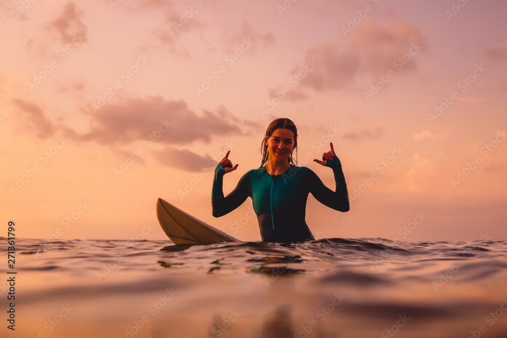 Smiling surfer woman sit on a surfboard in ocean. Surfing at sunset