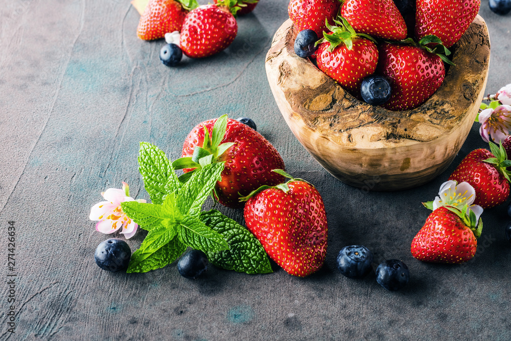 Close-up view of fresh blackberries, blueberries, strawberries and green mint leaves