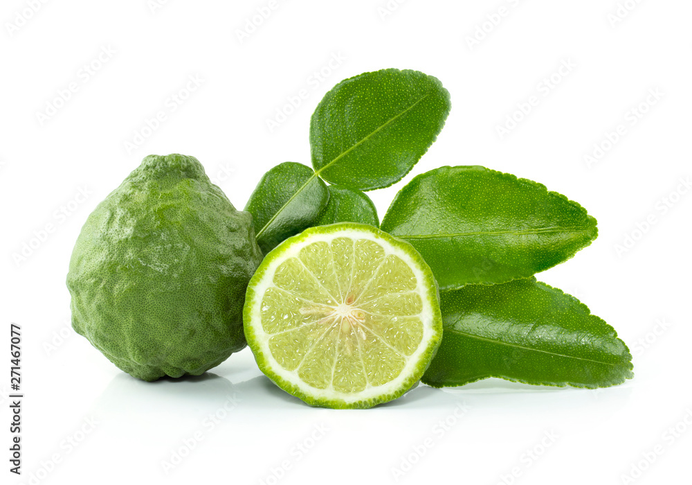 Fresh Bergamot fruits cut in half with leaves isolated on white background