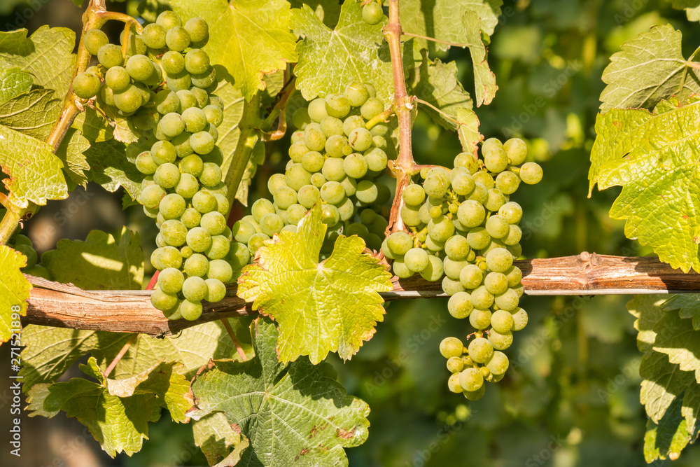 close-up of ripe bunches of Sauvignon Blanc grapes growing on vine in vineyard