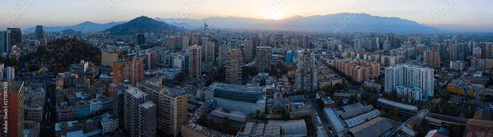 Aerial panorama of the city of Santiago de Chile during sunrise. Chile.