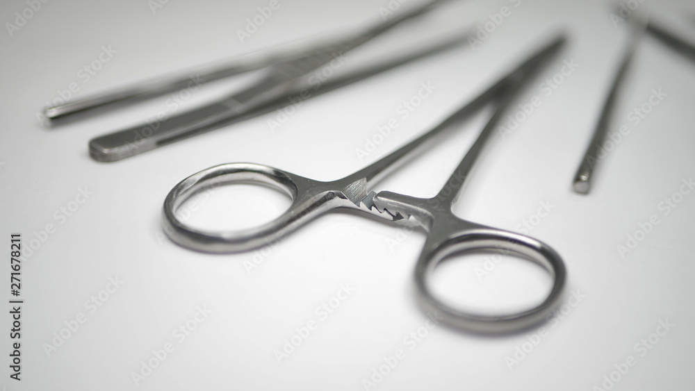 A pair of stainless steel surgical clamps and medical grade pointed probes on a white table.