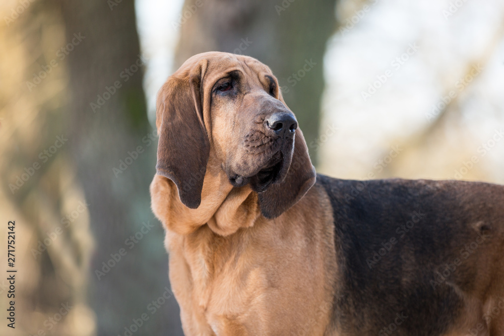 Hund im Schnee Bloodhound Rassehund Hündin mit langen Ohren