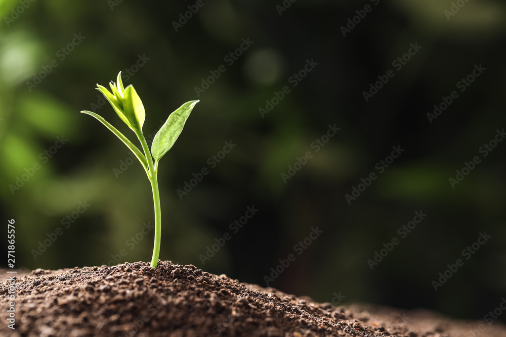 Young plant in fertile soil on blurred background, space for text. Gardening time