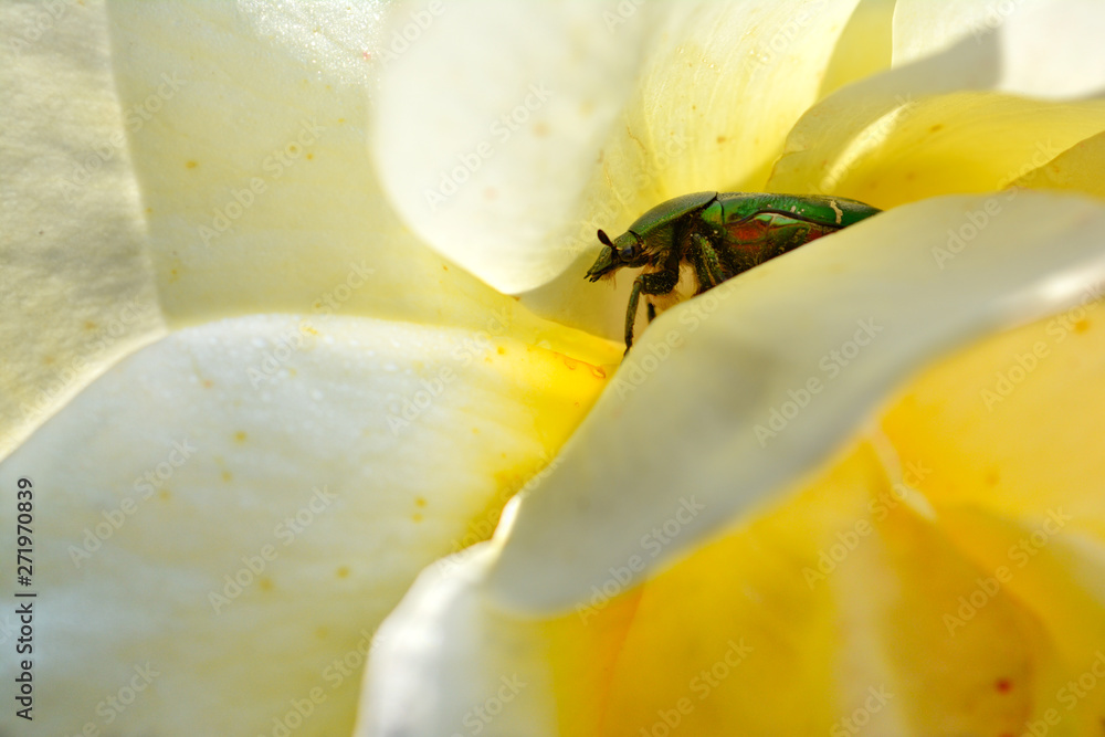 Cetonia aurata: grün schillernder Rosenkäfer in gelber Rosenblüte
