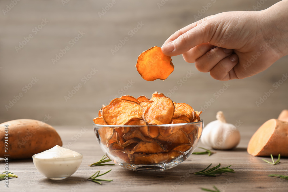 Woman taking sweet potato chip from bowl on table, closeup