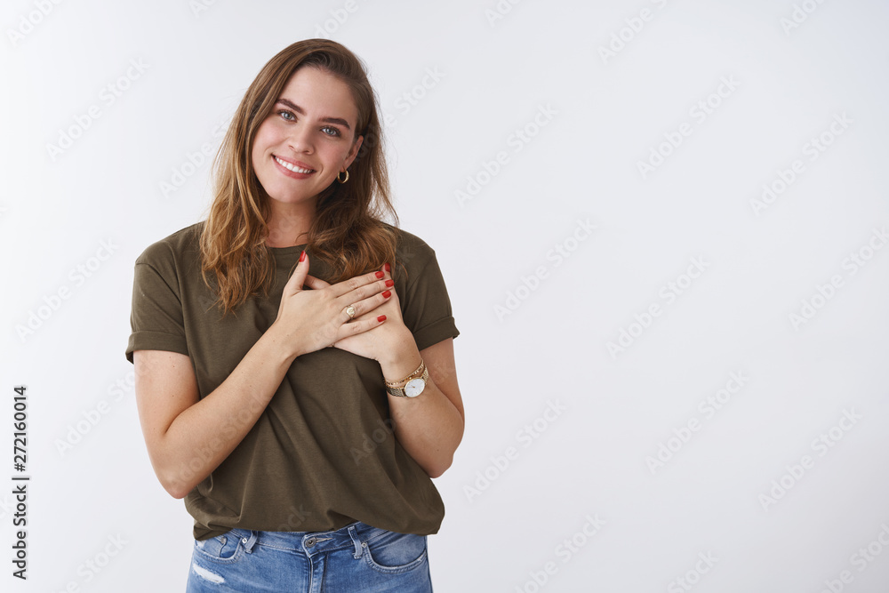 Romance, feelings, wellbeing concept. Portrait charming sincere charismatic girlfriend confessing love pressing hands heart tilting head smiling heartwarming being touched tender words
