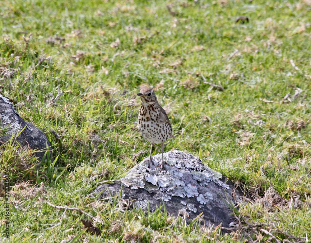 A mistle thrush is barely visible as it stands on a rock in a field.