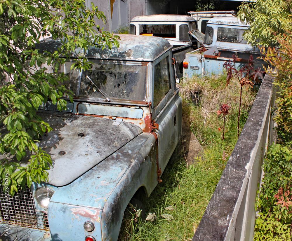 A collection of old rusty Land Rover Defenders in a garden with trees and bushes growing around them