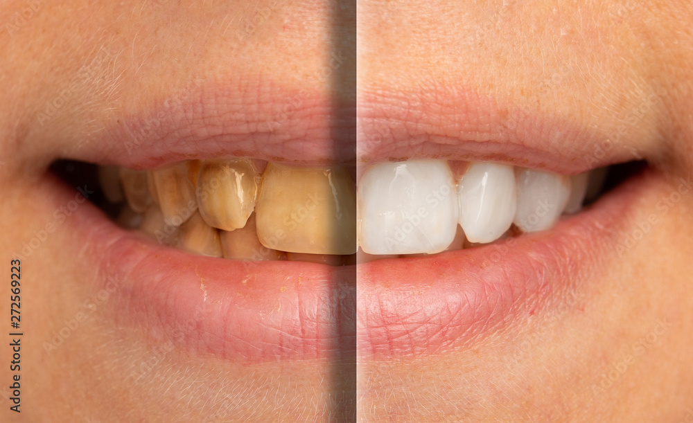 A close-up and split view on the mouth of a young Caucasian adult, before and after of cosmetic dentistry whitening procedure, where the teeth are bleached to remove stains.