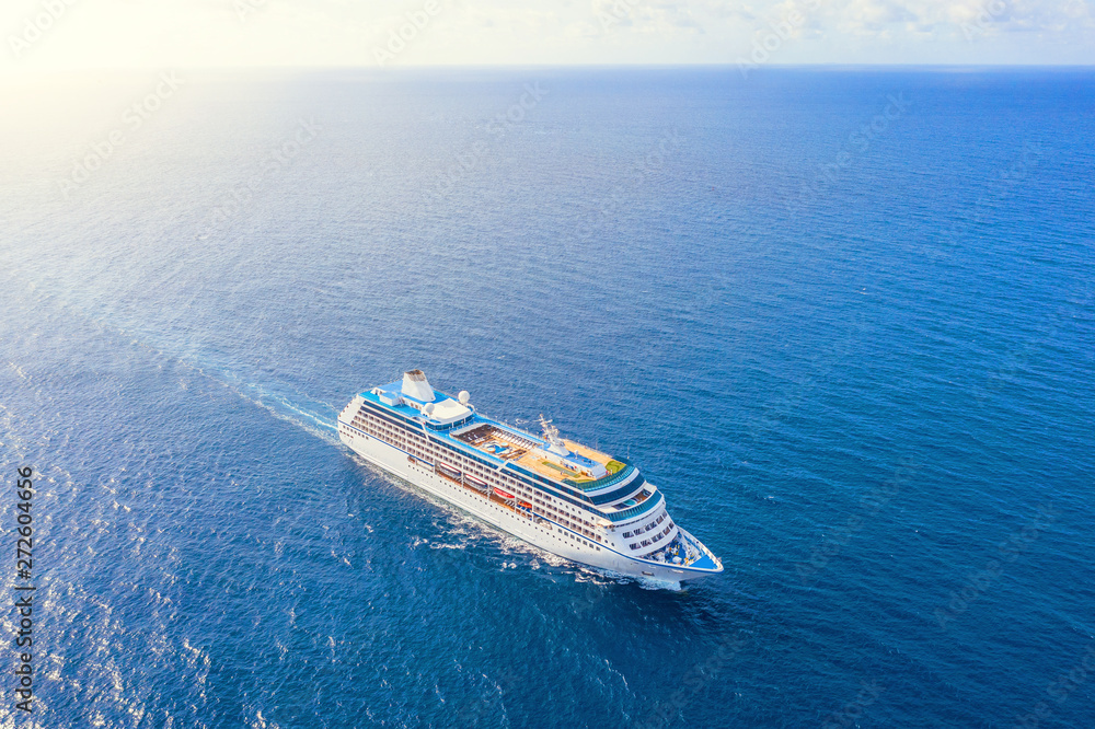 Cruise ship liner sails in the blue sea leaving a plume on the surface of the water seascape. Aerial view The concept of sea travel, cruises.