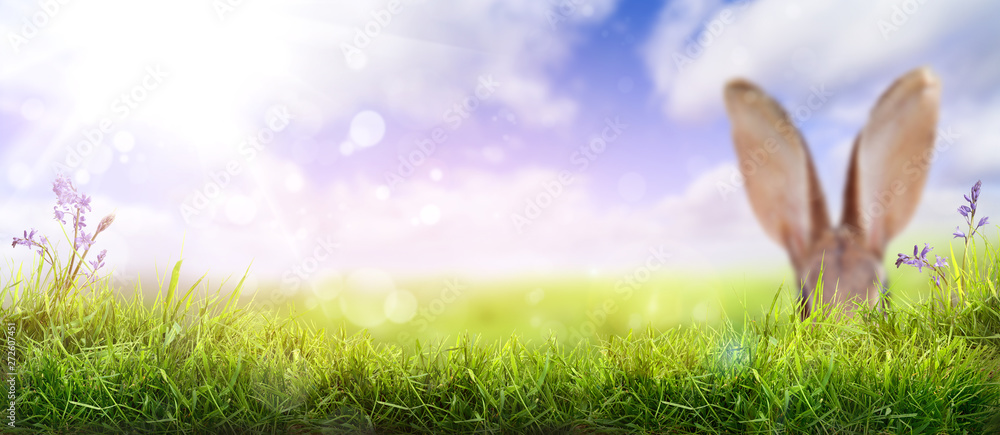 Lush spring green grass background with a sunny summer blue sky over fields with rabbit ears in the distance.